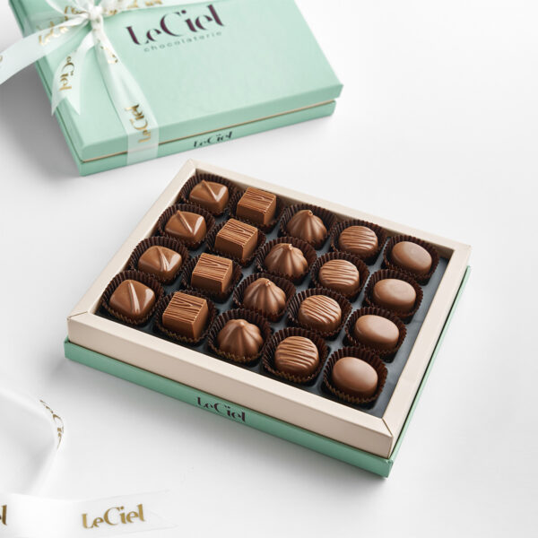 A thoughtfully selected box of 20 chocolate pralines with smooth, flavorful fillings. Features Pistachio, Hazelnut, Peanut, Coconut and Saffron praline.