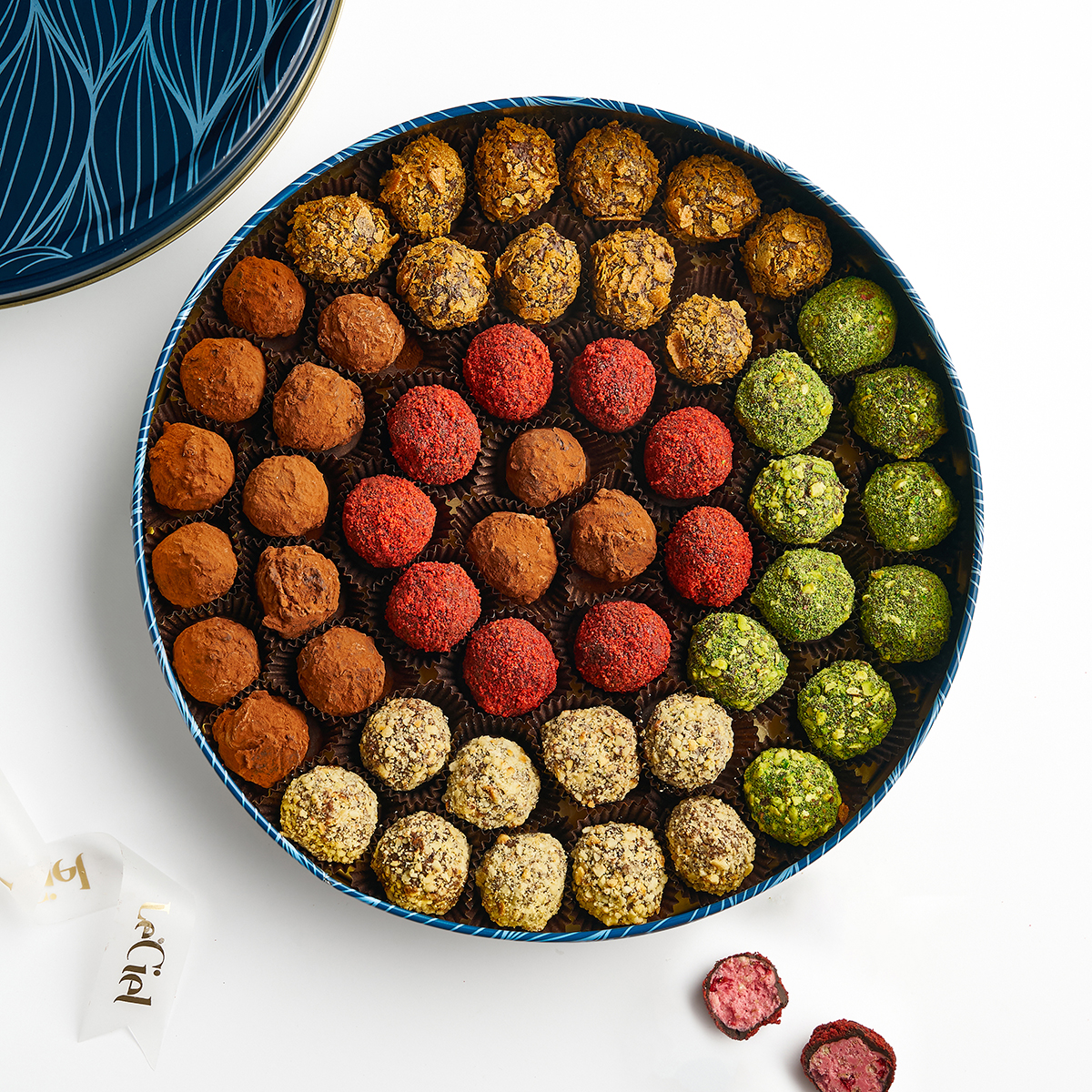 A luxurious box of 52 truffles from the Perles du Ciel collection, crafted with smooth centers and delicate coatings. Includes Pistachio, Almond, Lotus, Coffee and Mixed Berries.